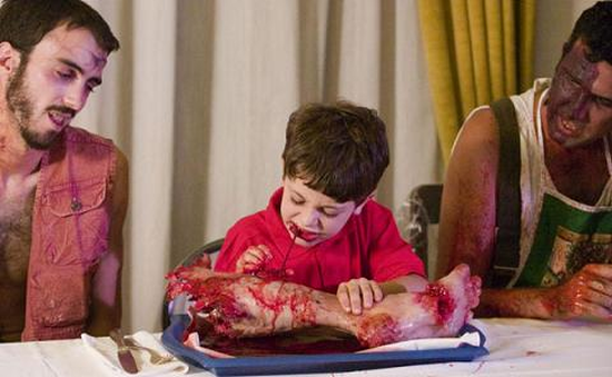 Why is a kid eating a human leg? And what's with those teeth?!? And what's with that goiter on the other dudes neck... and why is it exploding in a storm of pus on some guys face?!?!? What in the hell is going on here?!?