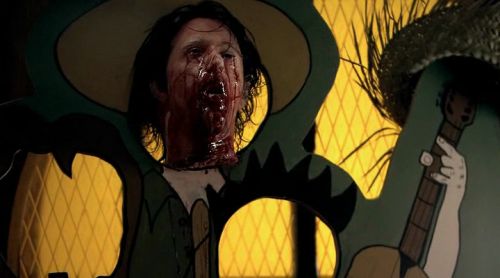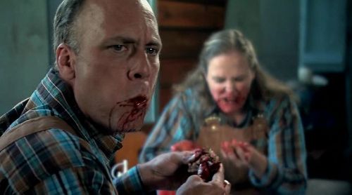 There's plenty of blood and gore all throughout this one; blood sprays, people are bitten, heads are severed, the infected are shot, stabbed and otherwise messily dispatched. It's a humorous flick, but it doesn't go lightly on the messy business.